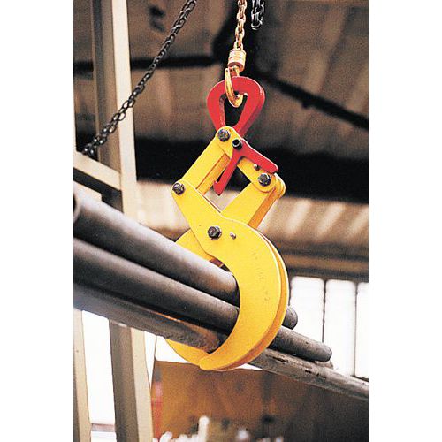 Pinzas equipadas con un bloqueo automático de la posición abierta que permite depositar la carga sin intervención del usuario. Para la elevación de cargas largas, se aconseja utilizar un balancín con dos abrazaderas de sujeción. Elevación de aros, tubos, cuadrados y perfiles pequeños.