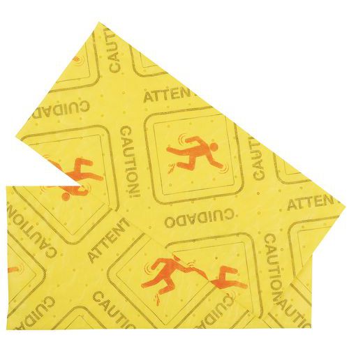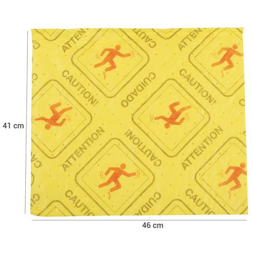 Absorbente con mensaje de advertencia para una doble seguridad. Permite a la vez secar los líquidos y evitar así los riesgos de resbalones. Su color de alta visibilidad y su pictograma de seguridad favorecen la vigilancia. Gran capacidad de absorción de líquidos industriales no químicas. Ideal para las zonas de fuerte tráfico donde existe el riesgo de resbalones, tropiezos y caídas
