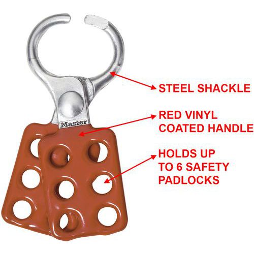 - Perfecta para bloquear a varios trabajadores, el gancho impide que se utilice el equipo durante reparaciones o ajustes.
