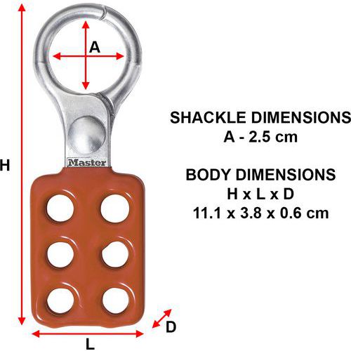 - El gancho de bloqueo de aluminio Master Lock n.º 416 tiene una mordaza interna de 25 mm de diámetro y puede alojar hasta seis candados.
