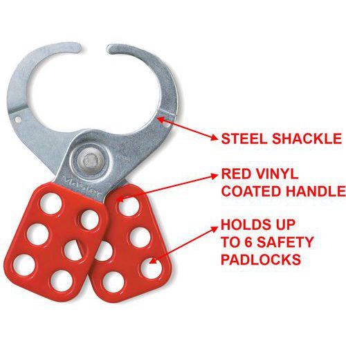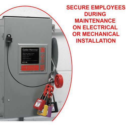 - Perfecta para bloquear a varios trabajadores, el gancho impide que se utilice el equipo durante reparaciones o ajustes.