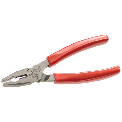 - Alicate universal de acabado pulido y barnizado, con asas revestidas con funda de PVC para mejor prensión y manejabilidad.