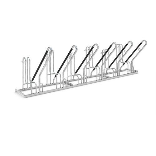 Aparcabicicletas moderno. Con arcos extraseguros que protegen las bicicletas contra robos. Resistente a la intemperie. Acabado galvanizado de calidad que no daña las llantas ni las ruedas. Soportes de fijación al suelo incluidos.