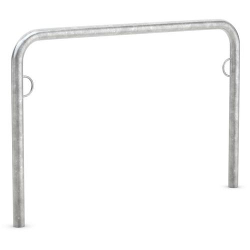 Aparcabicicletas en arco para su fijación en el hormigón. Proporciona un espacio de estacionamiento cómodo y seguro para bicicletas. Las bicicletas se pueden fijar fácilmente con los ojales de acero integrados a cada lado. Resistente a la intemperie. Acabado galvanizado de alta calidad.