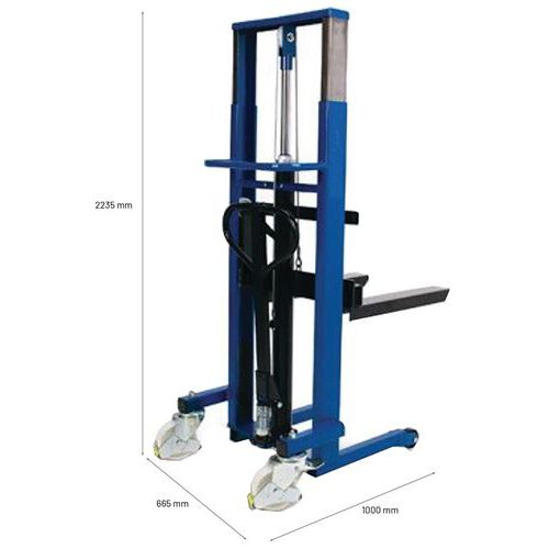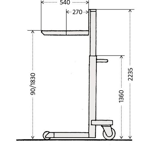| Nombre del producto | Apilador de doble mástil telescópico, Carga: 250 kg, Altura máx. elevación: 1830 mm, Longitud total: 1000 mm |