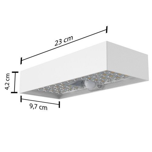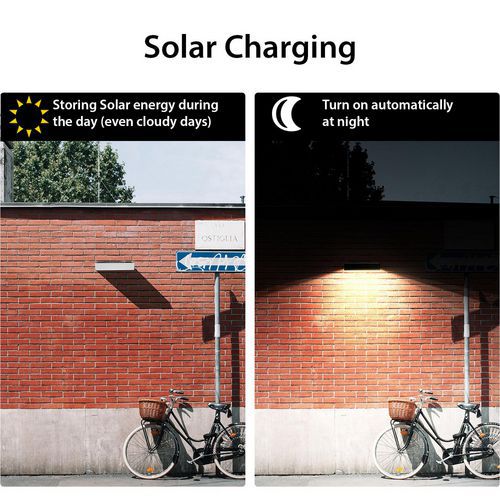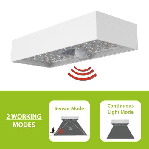 Aplique solar de policarbonato anti-UV y ABS, diseño contemporáneo y extremadamente refinado, IP65: resistente a golpes y a la intemperie, los componentes electrónicos son especialmente resistentes al agua. Funcionamiento: la lámpara se recarga durante el día con los rayos del sol. 2 modos de uso: 1) La lámpara se enciende automáticamente por la noche y mantiene una luminosidad del 50 % durante 5 horas. Después, (o cuando la carga de la batería es inferior al 30 %), la lámpara pasa al modo de ahorro de energía: la lámpara se enciende automáticamente al 100 % de luminosidad cuando se detecta un movimiento a una distancia de unos 6 metros y, a continuación, se apaga transcurridos 20 segundos sin que haya movimiento. 2) Modo detector de movimiento: la lámpara se enciende automáticamente al 100 % de luminosidad cuando detecta movimiento en una distancia ≤ 6 metros, después pasa al 5 % de luminosidad tras 20 segundos de inactividad. La lámpara está equipada con LED SMD de última generación