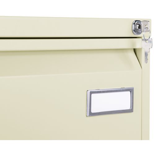 La protección contra el vuelco impide que se abra más de un cajón por accidente. El tirador que ocupa todo el ancho del cajón permite un buen agarre. Archivador con cajones clásico para carpetas de formato A4, folio y gran folio. El producto tiene una base para cada uno de los cajones. La cajonera puede cerrarse con una llave suministrada (1 juego de dos llaves). Consejos de seguridad: - Instalar el mueble sobre una superficie plana - Fijarlo a la pared o a un tabique con una fijación adecuada - Verificar que no se supera la carga máxima aconsejada y que se mantiene una buena distribución - Sistema de cierre con capacidad para 50 carpetas colgantes.