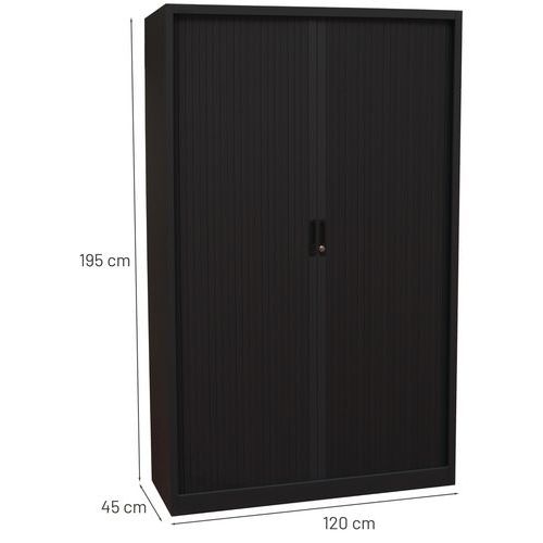 Descubra la facilidad de uso de este compacto y extraancho armario alto. Ajuste las baldas y utilícelas también para las carpetas colgantes. Acabado con pintura epoxi resistente a los arañazos. Cierre las persianas de plástico con una cerradura de cilindro. Consejos de seguridad: - Instalar el mueble sobre una superficie plana - Fijarlo a la pared o a un tabique con una fijación adecuada - Verificar que no se supera la carga máxima aconsejada y que se mantiene una buena distribución Balda carga maxi (kg) : 45 kg Clasificación fuego : M1 Garantía al cliente : 10 años