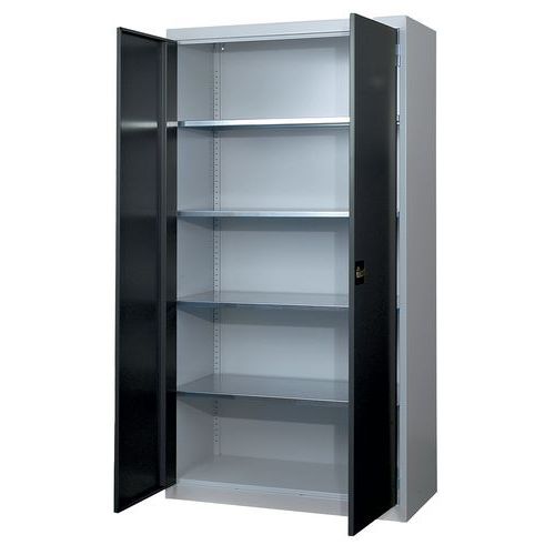 Armario con puertas batientes con cerradura de seguridad de asa giratoria. De chapa de acero de calidad superior. Armario con puertas batientes con cerradura de seguridad de asa giratoria. De chapa de acero de calidad superior. 4 estantes galvanizados. Capacidad de carga por estantería: 60 kg. Se entrega montado.