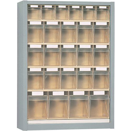 - Retire fácilmente las cajas basculantes transparentes de este armario de acero.