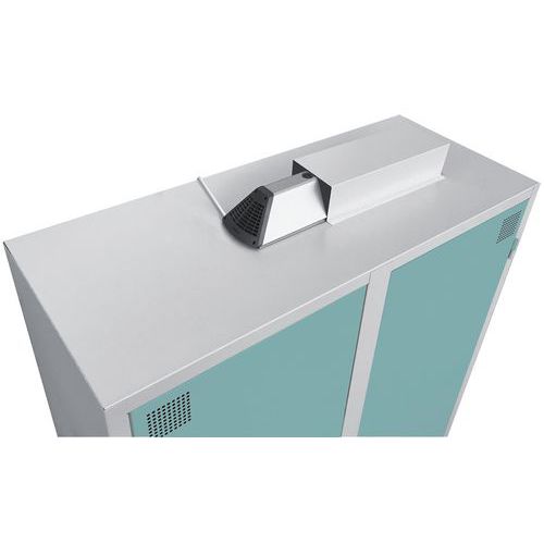 Armario de desinfección rápida, eficaz y económica con tecnología de ozono. Balda con numerosas perforaciones para libre circulación y ventilación adecuada del ozono. Armario con tapa de protección y testigo de funcionamiento de Air Care. Producto diseñado y fabricado en Francia. Solución Ozone: Desinfección total en tiempo récord de las prendas y herramientas.