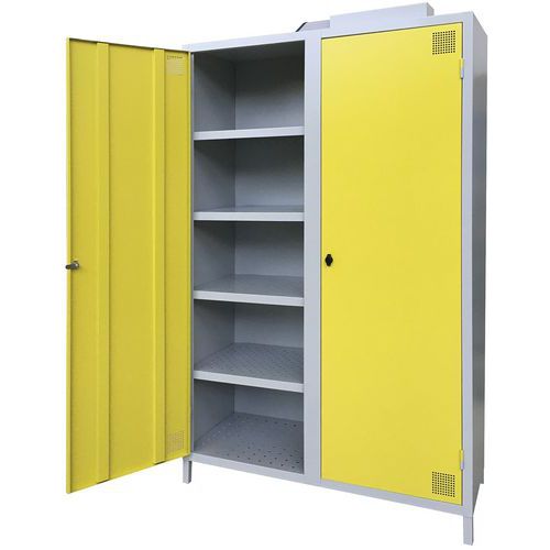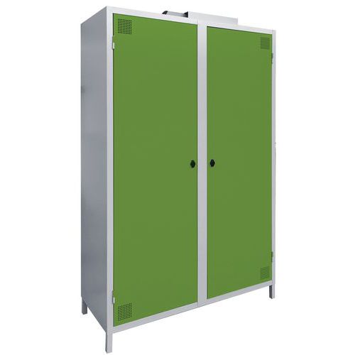 Armario de desinfección rápida, eficaz y económica con tecnología de ozono. Balda con numerosas perforaciones para libre circulación y ventilación adecuada del ozono. Armario con tapa de protección y testigo de funcionamiento de Air Care. Producto diseñado y fabricado en Francia. Solución Ozone: Desinfección total en tiempo récord de las prendas y herramientas.