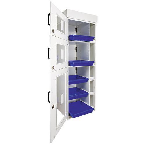 Armario de seguridad departamental para la separación de ácidos y bases. Equipado con patas con cilindro para nivelación. Cubetas de retención de polipropileno sobre raíles deslizantes. Construcción resistente a las agresiones de los vapores corrosivos. Orificios de ventilación para conectar a una ventilación. Conforme a las recomendaciones de INRS.