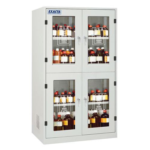 Armarios de seguridad para el almacenamiento de productos químicos ácidos o bases. División en compartimientos superpuestos para almacenar por separado las distintas familias de productos químicos no inflamables. Compartimentos equipados de estanterías de retención fijas de acero pintado e inoxidable de altura ajustable. Puertas macizas batientes de pared simple. Cierre con llave. En conformidad con la normativa EN16121 SEVERAL. Construcción monobloque de chapa de acero robusta.