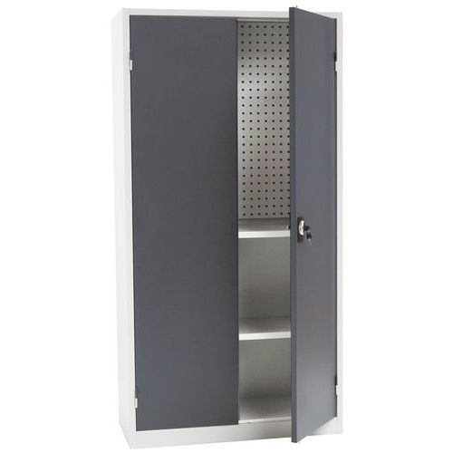 Se suministra con 2 estantes regulables, bolsas de plástico y ganchos n.º 2. Panel para herramientas con orificios cuadrados (dimensiones: 10 x 10 mm, distancia entre los orificios: 38 mm).