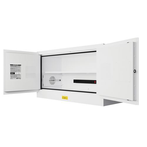 El acero soldado de doble pared es una estructura sólida capaz de contener posibles explosiones. El sistema de ventilación de descompresión con filtro integrado retiene el humo y absorbe las toxinas nocivas. Las placas de cierre de puertas de acero reforzado garantizan que las puertas del armario permanezcan cerradas. Los dispositivos de protección contra llamas de las bisagras de las puertas evitan incendios secundarios fuera del armario. Los amortiguadores con muelle reducen la emisión de humo y gases nocivos cuando la temperatura del armario alcanza los 135 °F.