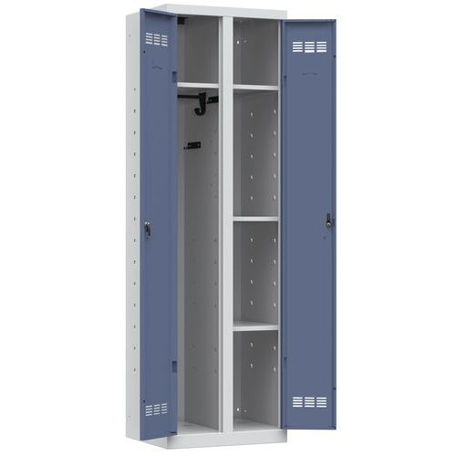 Taquilla multiservicio con 2 puertas. Compuesto en una parte por una percha y otra parte para almacenamiento. Gama moderna que combina calidad, seguridad y diseño. Soldada de fábrica, para una robustez óptima. Nivel muy elevado de resistencia a la fractura. Consejos de seguridad: - Instalar el mueble sobre una superficie plana - Fijarlo a la pared o a un tabique con una fijación adecuada - Verificar que no se supera la carga máxima aconsejada y que se mantiene una buena distribución