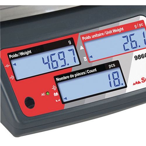 - Visibilidad perfecta gracias a 3 pantallas: peso bruto o neto, peso unitario y número de unidades.