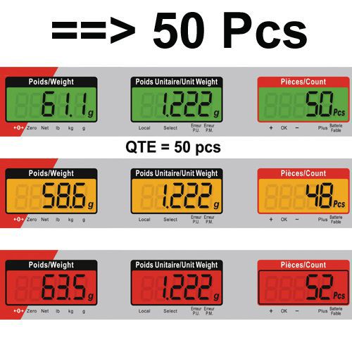 - Visibilidad perfecta gracias a 3 pantallas: peso bruto o neto, peso unitario y número de piezas.