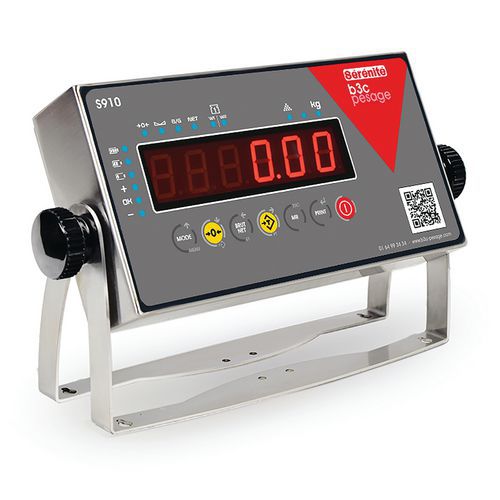 Balanza de columna con indicador independiente IP65, metrología legal S910 fiable para todos los pesajes. Función de pesaje, tara, contador con 5 memorias de umbral en control +/-. Pantalla LED de muy alta visibilidad. 2 salidas de datos RS232. Con alimentación integrada. Compatible con impresora con tickets autoadhesivos personalizables. CE Garantía al cliente : 1 año Protección IP : IP 65