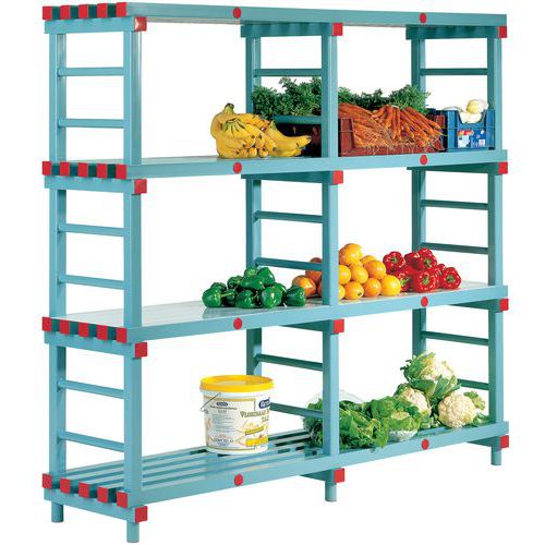 Complete su estantería Poly-Store con la ayuda de un nivel intermedio. Ángulos redondeados para conservar los productos almacenados correctamente. Resistente a las sales y a los ácidos procedentes de los productos alimentarios. Fabricada con materiales sintéticos antigolpes de gran resistencia.