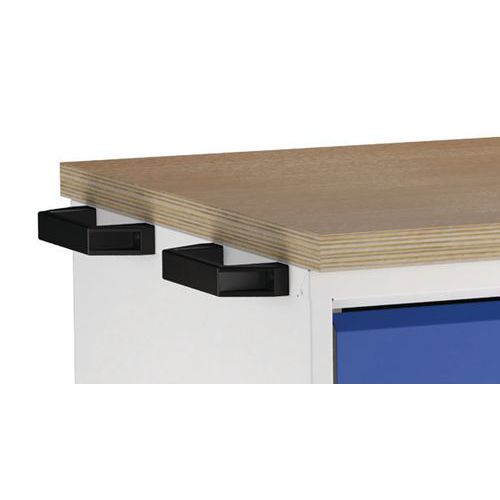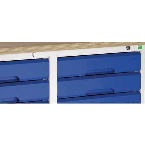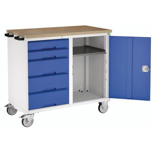 Banco de trabajo móvil robusto y con cierre con una superficie de trabajo sólida laminada.
