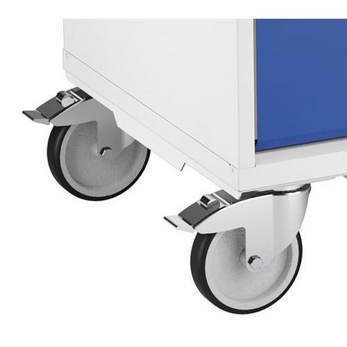 Equipado con 4 ruedas de goma, 2 de ellas pivotantes con freno.