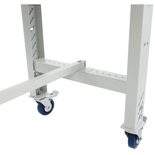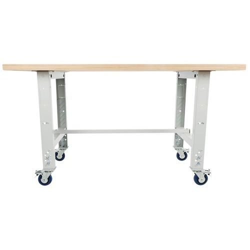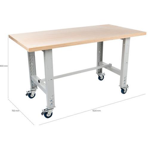 Banco de trabajo de altura regulable hasta 1050 mm. Tablero multicapa de haya o laminado gris de alta resistencia. 4 ruedas giratorias con frenos permiten mover el banco de trabajo según tus necesidades. Elección de anchura: 1520 o 2000 mm. Posibilidad de instalación de una superestructura con accesorios.