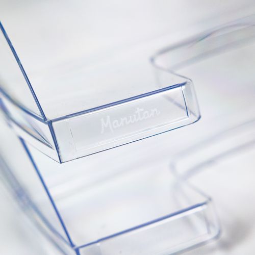 | Nombre del producto | Bandeja para documentos transparente, Capacidad (n.° de hojas): 300, Material: PVC |