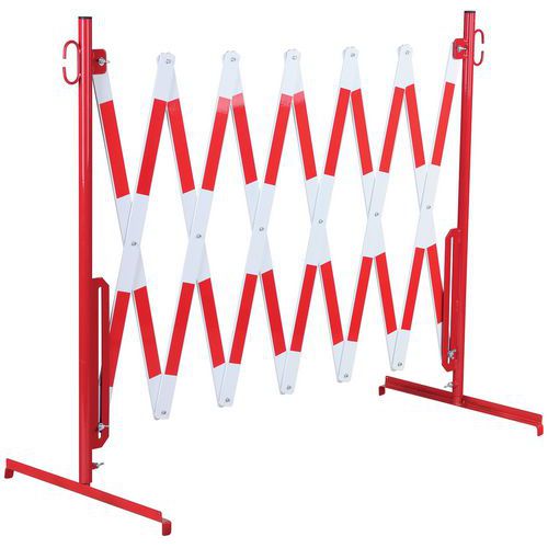 Barrera ampliable de acero con patas en los 2 lados que permite bloquear temporalmente una zona peligrosa. La alternancia de los colores atrae la atención de los usuarios e indica peligros. Posibilidad de conectar varias barreras entre ellas. Ocupa poco espacio cuando se pliega. Certificado TÜV.