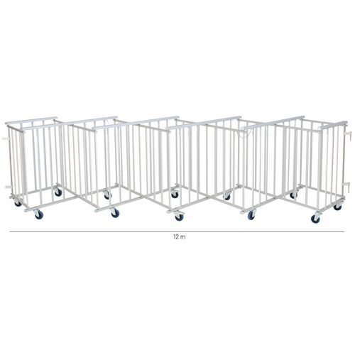 Barrera extensible autoportante y robusta. Soporta fuertes presiones: conviene a cualquier acontecimiento que atraiga a mucha gente (manifestaciones deportivas y culturales, conciertos, salones, estadios, parques de atracciones, etc.). Fácil de utilizar y de almacenar: fácil y rápido de poner en su lugar. Se despliega con ruedas y se estabiliza en 5 segundos. Bloqueo de las ruedas: por presión simple en el freno. Eje y tornillos en acero inoxidable: resiste a la intemperie sin riesgo de óxido. Las ruedas se componen de: ruedas de goma azul, chapas de acero zincado, embutidas y pivotantes. Fabricado en la UE