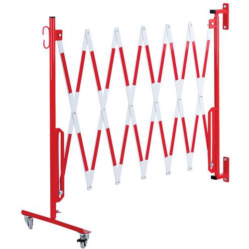 Barrera de acero extensible con ruedas y fijación mural para delimitación temporal. Bandas bicolores para mayor visibilidad. Ideal solamente para uso en interiores. Fácil de manejar, almacenar y usar gracias a sus ruedas con freno. Certificado TÜV.