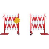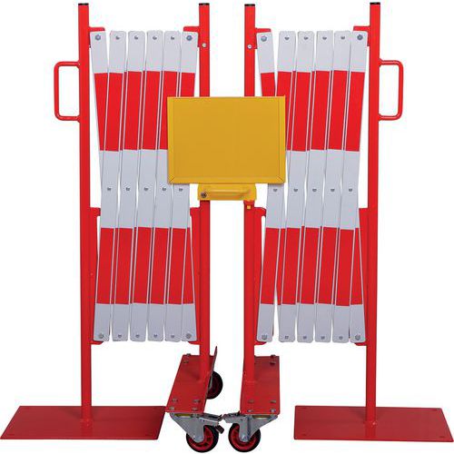 Juego de barreras extensibles que permiten bloquear temporalmente y asegurar el acceso a superficies anchas. El elemento de fijación central permite conectar las 2 barreras entre sí, pero también mostrar una nota informativa en formato A4. Resistentes y estables: barreras con ruedas con frenos para un uso sencillo y seguro. Revestimiento de polvo. Certificado TÜV.