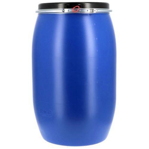 Barril cilíndrico de PEAD para un almacenamiento y transporte seguros. Tapa sellada y anillo de acero galvanizado con palanca precintable. Homologado por la ONU para el transporte de mercancías peligrosas. Tapa negra con junta de EPDM. Los modelos de 120 L y 200 L carecen de asas.