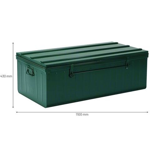 Baúl ultrarresistente de material de chapa de acero XC grosor 5/10 mm. Resistencia a la superposición gracias a refuerzos superiores soldados. Fondo con otros refuerzos soldados para una mayor protección frente a impactos. Diseño inteligente: robustez y ligereza gracias a las paredes con nervaduras. Modelo de baúl registrado y patentado que garantiza una fabricación francesa de calidad. Guarde, clasifique, proteja, transporte y mil cosas más