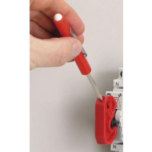 Cuerpo fabricado con materiales dieléctricos. Colocación rápida. Compatible con los disyuntores estándar de 44 mm. El orificio de 7 mm de diámetro permite el uso de candados con un arco de hasta 6,5 mm de diámetro.