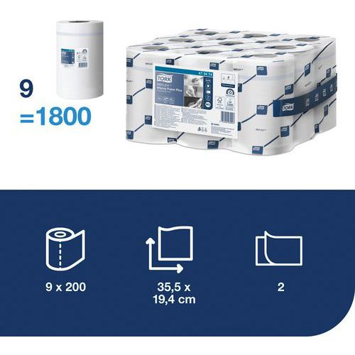 Bobina de papel muy resistente y ultraabsorbente con tecnología Quick Dry. Modelo en 2 grosores. Hojas precortadas.