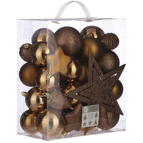 - Juego de 40 piezas: bolas y adornos varios, con una estrella para coronar el árbol.