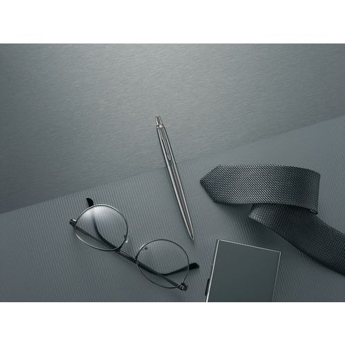 Bolígrafo M Jotter C. Cuerpo de acero inoxidable con acabado rojo, atributos brillantes y clip en forma de flecha. Mecanismo de apertura y cierre mediante pulsador. Flujo de tinta óptimo para un confort de escritura.