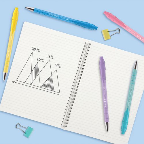 Bolígrafo retráctil Flexgrip, punta media, paquete de 5. Tinta fluida gracias a la tecnología Floating Ball y a su tinta Lubriglide® resistente a la luz. Ofrece una escritura suave y cómoda en un elegante diseño pastel. Flujo de tinta negra regular y constante para una escritura sin esfuerzo. Con un cuerpo de goma y una empuñadura texturizada, este bolígrafo retráctil ofrece una comodidad y un control excepcionales. Su diseño retráctil permite extraer y retraer la punta con un simple clic. El práctico clip le permite fijar el bolígrafo a una agenda de bolsillo o a un bloc de notas para guardarlo y transportarlo fácilmente.