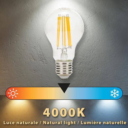 Bombilla LED de filamentos, con una duración de 20 000 horas (mucho más que otros modelos que encontrará en el mercado). Puede durar más de 15 años (con un uso diario de 3 horas). Produce 1055 lúmenes de iluminación instantánea, sin tener que esperar a que la bombilla se caliente. Con difusor transparente que hace que la luz sea muy similar a la de las antiguas bombillas incandescentes. La tecnología LED de filamentos proporciona un haz hiperdifuso a 330 grados. Con una temperatura de color de 4000 Kelvin, la bombilla proporciona una luz blanca cálida, creando una atmósfera acogedora en cualquier estancia. Perfecta para todas las estancias de la casa, como el dormitorio, el salón, el baño, etc., así como para la oficina. Ideal para lámparas de mesillas de noche, campanas extractoras, lámparas de oficina, lámparas de araña, apliques, etc. Bombilla de clase energética A: el máximo nivel de ahorro y eficiencia. Consume 5 vatios de energía, tiene un bajo coste de funcionamiento y proporc