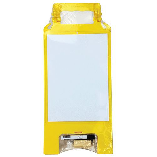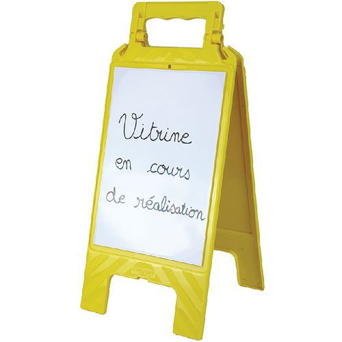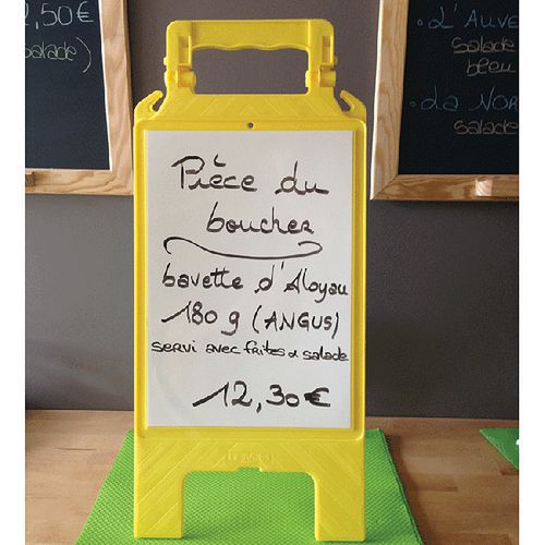 Caballete con mensaje borrable, Color: Amarillo, Altura: 600 mm, Ancho: 275 mm, Espesor plegado: 23 mm