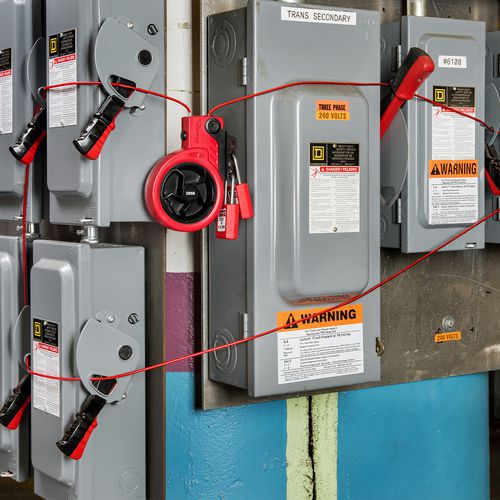 - Dispositivo de bloqueo con cable retráctil Master Lock ideal para válvulas y otros sistemas de bloqueo.