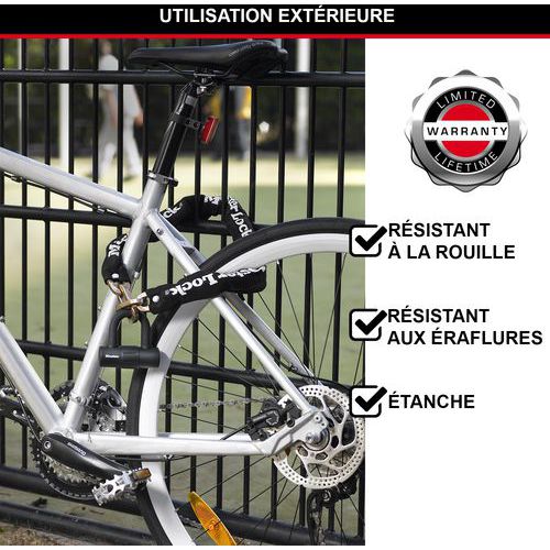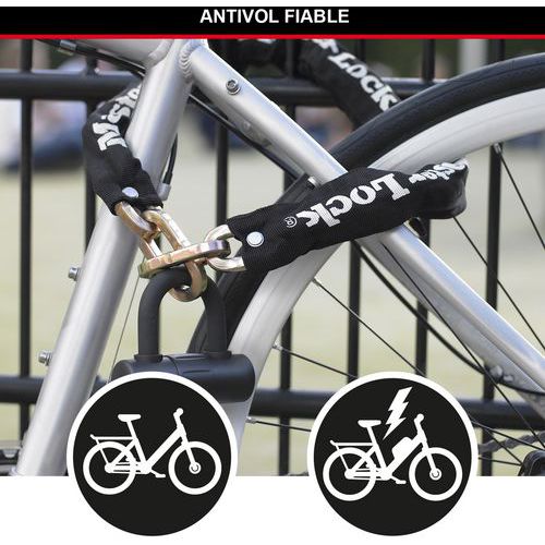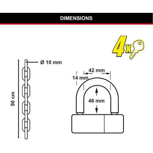 - Cadena de acero endurecido con eslabones cuadrados de 90 cm x Ø 10 mm - Grillete de doble cierre mini U Ø 14 mm suministrado con 4 llaves.