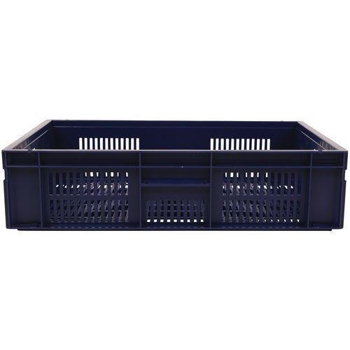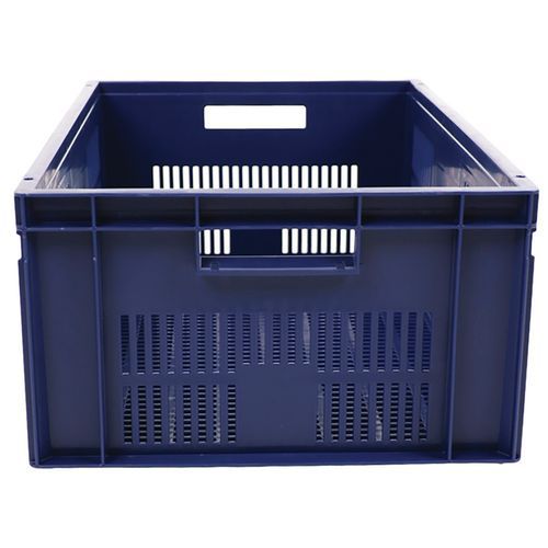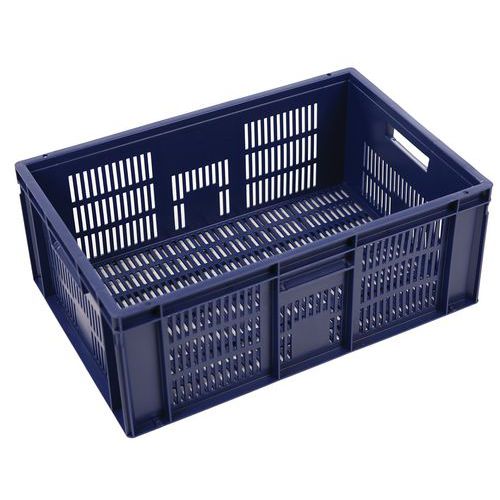Caja conforme a la norma europea muy estable al apilarla. Diseño que garantiza la máxima ventilación mediante unas paredes caladas. Manipulación sencilla gracias a sus dos asas abiertas de gran tamaño. Resistente a aceites, grasas y a numerosos productos químicos. Fabricada de polipropileno.