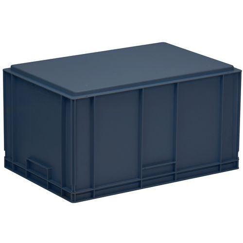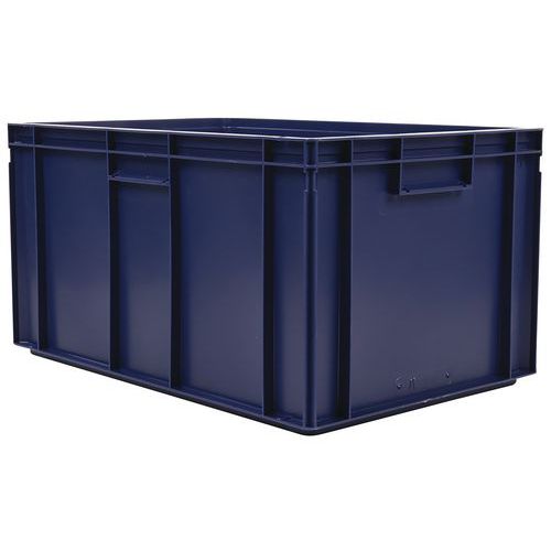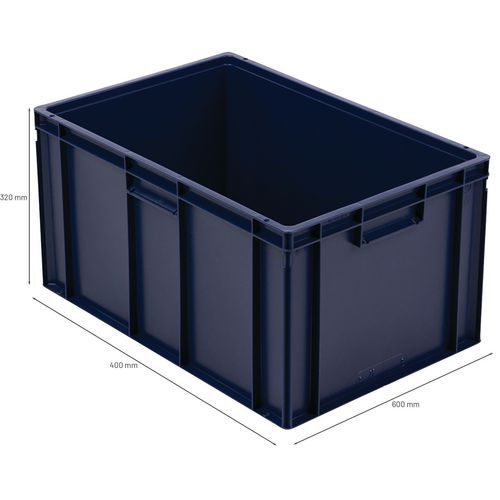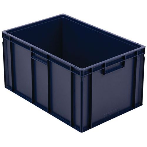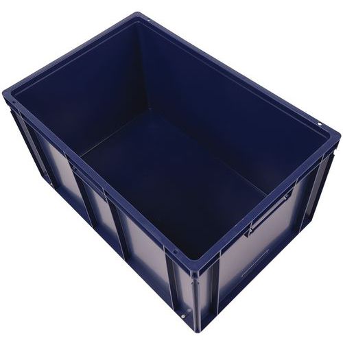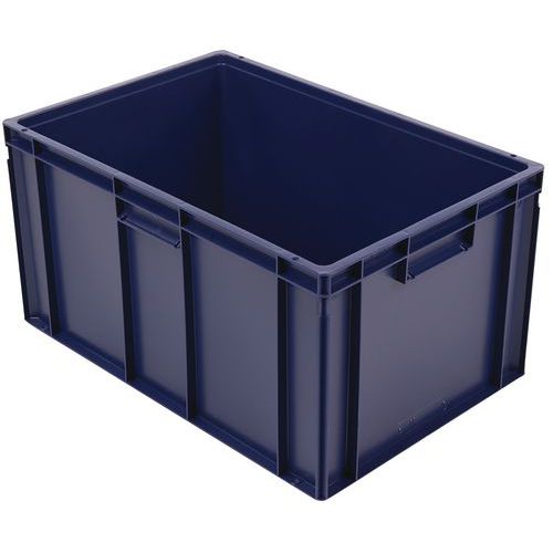 Caja norma Europa muy estable al apilarla. Asas firmes para una manipulación sencilla de gran capacidad. Resistente a aceites, grasas y a numerosos productos químicos.