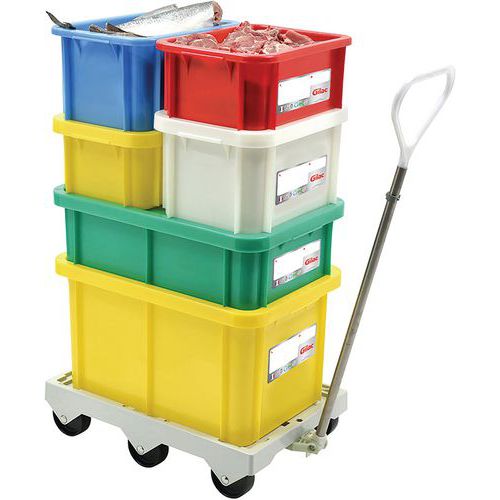 Caja apilable con tapa conforme al sistema HACCP de conservación de alimentos. Marcado fiable y fácil de borrar gracias a la etiqueta IML integrada. Asas retráctiles para una mejor manipulación. Apilable sin tapa. Diseño sin zona de retención. Se puede lavar a máquina. Compatible con todas las plataformas móviles de 4 y 6 ruedas de Gilac.
