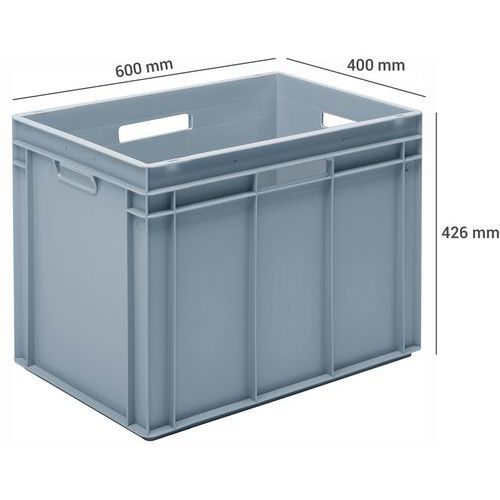 | Nombre del producto | Caja apilable norma Europa color gris RAKO, Capacidad: 90 L, Apilable: sí, Altura total: 426 mm |