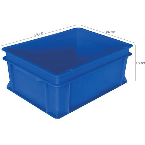 Caja apilable norma Europa. Equipada con paredes macizas, fondo macizo y asas con forma de concha.