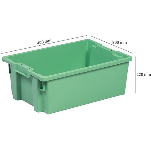 Apilable o encajable con un simple giro gracias a su estructura asimétrica. Apiladas ahorran un 65 % de espacio. Fondo plano para su compatibilidad con cintas transportadoras automáticas. Caja apilable apta para uso alimentario. Disponible en 5 modelos. Carga máx. (kg) : 25 kg Alimentario